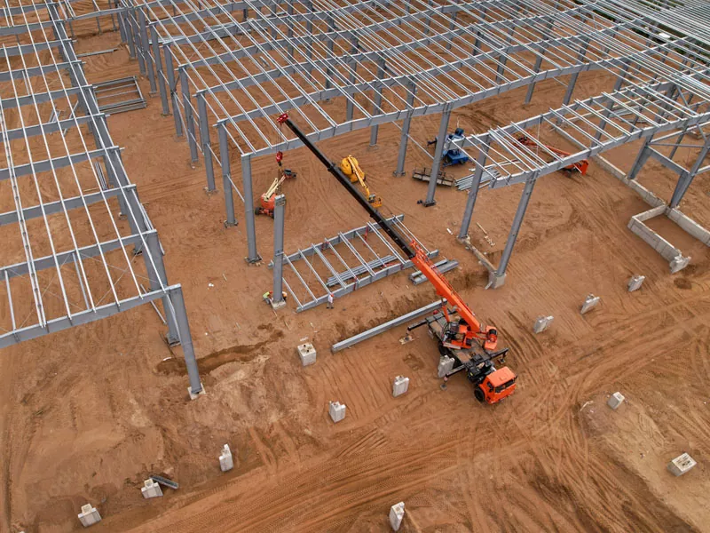 プレハブコンポーネントは建設現場に配達され、クレーンやその他の重機を使用して組み立てられます。通常、設置プロセスは、列を基礎に固定して固定することから始まります。次に、柱を接続するためにビームを取り付けて、倉庫のフレームを形成します。屋根のトラスが建てられ、フレームに固定され、屋根系システムをサポートします。この体系的なアプローチにより、頑丈で安定した構造が保証されます。