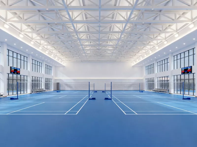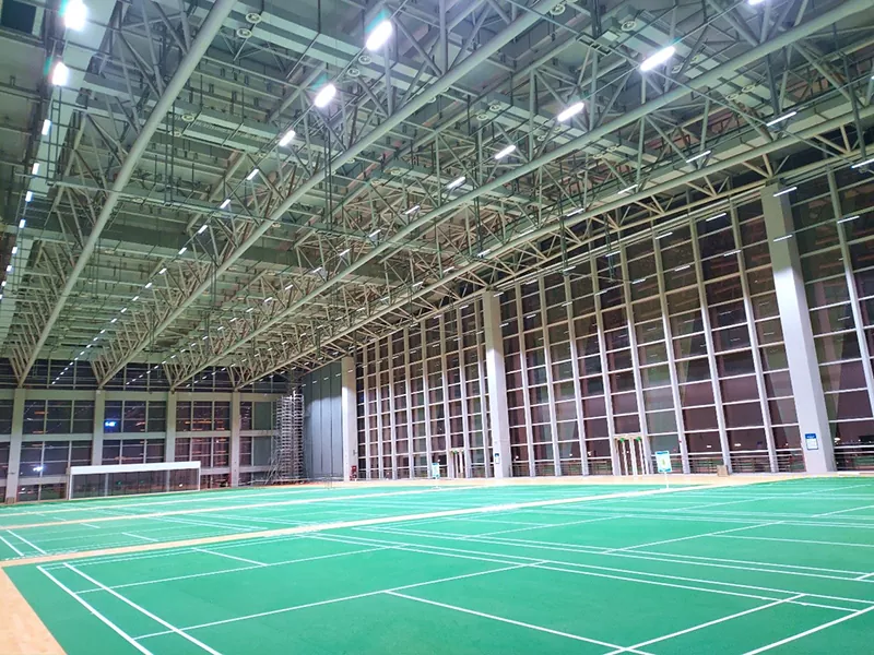 大スパン無柱空間:鉄骨造バドミントン場は、従来のコンクリート造の建物に比べ、会場内の視界を遮る柱が無いため、会場のスペースを大幅に節約するとともに、観客にとってもより良い観戦体験を提供します。